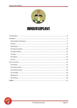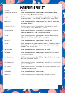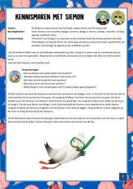 Rode draad: Tijdens de eerste activiteit maken de kinderen kennis met verschillende voorwerpen die te maken hebben met een tijdsaanduiding. Ook vinden ze een brief van Siemon waarin hij vertelt dat hij lang moet wachten voordat hij eindelijk op avontuur gaat. Siemon vindt wachten heel saai, en daarom vraagt hij de kinderen dit samen met hem te doen. Siemon vraagt de kinderen in de eerste brief om een brievenbus te maken, zodat hij zijn brieven steeds op dezelfde plek kan bezorgen. Om inzichtelijk te maken hoelang de kinderen en Siemon nog moeten wachten, maak je een tijdlijn op de muur van je lokaal. De tijdlijn wordt gevormd door alle dieren die Siemon in het boek tegenkomt. Aan het begin van elke activiteit ontvangen de kinderen opnieuw een brief van Siemon. Na elke activiteit wordt de afbeelding van Siemon verplaatst naar het dier op de tijdlijn dat hoort bij de activiteit. Aan het eind van het project bedenk je met de klas een eigen avontuur, dat je met ze gaat ondernemen. Organiseer bijvoorbeeld een spelletjesmiddag of speurtocht. In de afsluitende activiteit geven we suggesties.