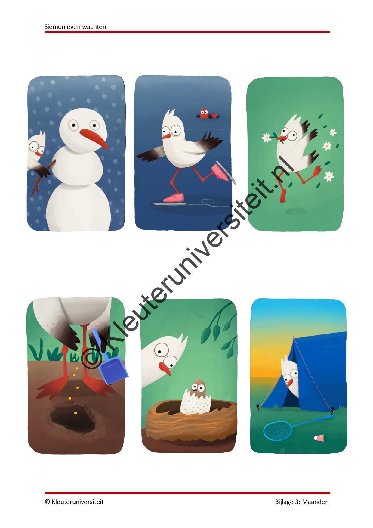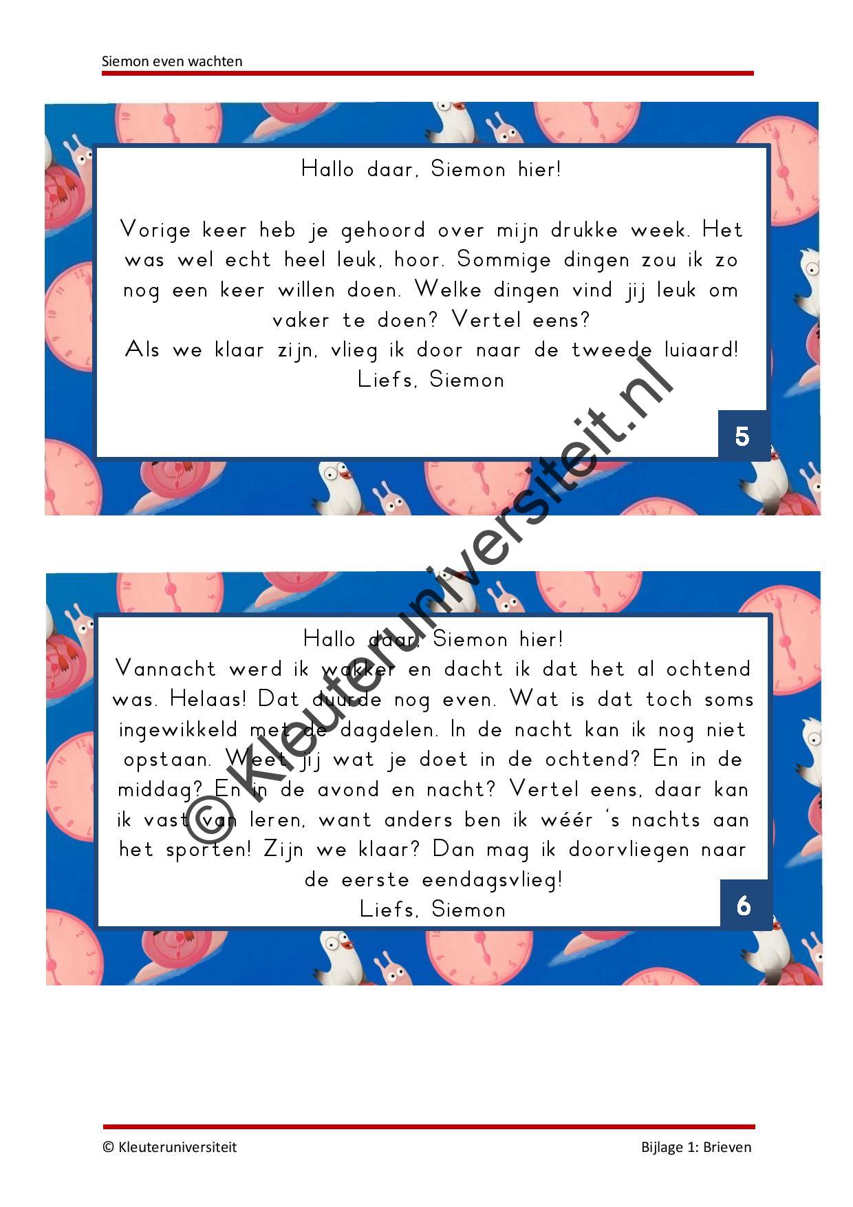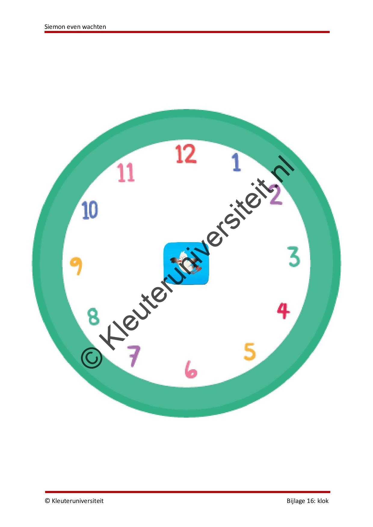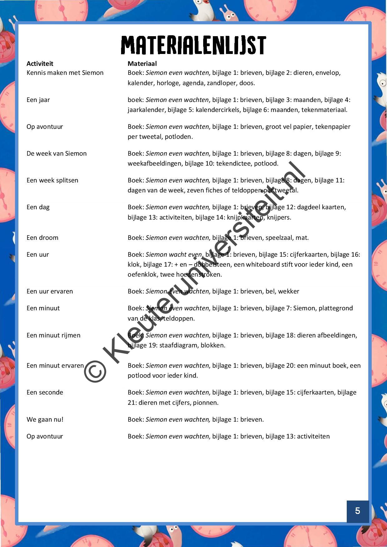 Rode draad: Tijdens de eerste activiteit maken de kinderen kennis met verschillende voorwerpen die te maken hebben met een tijdsaanduiding. Ook vinden ze een brief van Siemon waarin hij vertelt dat hij lang moet wachten voordat hij eindelijk op avontuur gaat. Siemon vindt wachten heel saai, en daarom vraagt hij de kinderen dit samen met hem te doen. Siemon vraagt de kinderen in de eerste brief om een brievenbus te maken, zodat hij zijn brieven steeds op dezelfde plek kan bezorgen. Om inzichtelijk te maken hoelang de kinderen en Siemon nog moeten wachten, maak je een tijdlijn op de muur van je lokaal. De tijdlijn wordt gevormd door alle dieren die Siemon in het boek tegenkomt. Aan het begin van elke activiteit ontvangen de kinderen opnieuw een brief van Siemon. Na elke activiteit wordt de afbeelding van Siemon verplaatst naar het dier op de tijdlijn dat hoort bij de activiteit. Aan het eind van het project bedenk je met de klas een eigen avontuur, dat je met ze gaat ondernemen. Organiseer bijvoorbeeld een spelletjesmiddag of speurtocht. In de afsluitende activiteit geven we suggesties.
