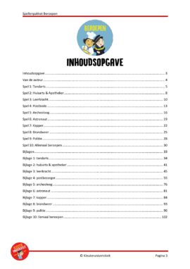 Wat een super leuk spellenpakket. De spellen zijn goed te gebruiken bij het thema beroepen maar ook bij losse beroepenthema’s. In dit pakket staan spellen bij 10 verschillende beroepen. De spellen zijn goed in te zetten tijdens een circuit, speel- werkles of tijdens andere vrije momenten. Maar er staan ook buitenspellen in.