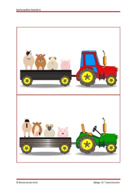 Als alle papieren zijn ingevuld, gaan de kinderen naar de boerderijwinkel. Hier verkoopt de boer allemaal lekkere verse groenten: pompoen, wortels, komkommers en nog veel meer. De kinderen doen zelf boodschappen en begrijpen hoe kopen en betalen werkt in een winkel. Er wonen veel dieren op de boerderij, sommige hebben jongen gekregen. Tijdens het spel ‘Koetjes en kalfjes’ leren de kinderen over de boerderijdieren en hun jongen. Tegelijkertijd leren ze de getalsymbolen en koppelen ze hoeveelheden. Bij het spel ‘Boerderijdier of niet’ wordt hun kennis van dierenwereld getest: is krokodil een boerderijdier of toch niet? Bij dit dobbelspel leren de kinderen meer over wilde dieren en boerderijdieren, en tegelijkertijd oefenen ze aanwijzend en resultatief tellen. De allerlaatste klus die de kinderen op de boerderij moeten klaren is het vervoeren van de boerderijdieren met een rode en een groene tractor. Hierbij is als team samenwerken essentieel.