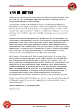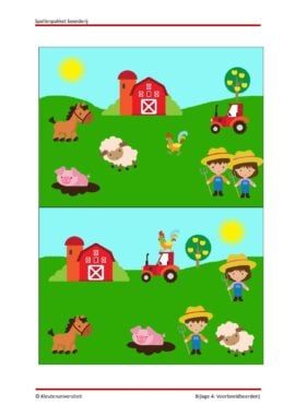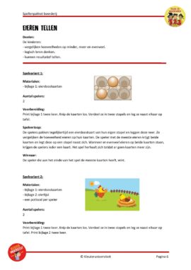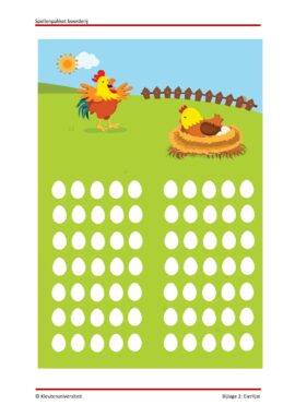 Ze beginnen met wat lichter werk: het tellen van de eieren in eierdozen en het vergelijken van hoeveelheden. Zo leren ze logisch nadenken en ze oefenen met resultatief tellen. Daarna tellen ze hoeveel kuikens een kip heeft. Bij dit spel maken ze met vingerverf afdrukken en oefenen hun fijne motoriek. Bij het volgende spel bekijken de kinderen verschillende boerderijplaatjes en omschrijven ze deze aan elkaar. Hierbij leren ze goed kijken, duidelijke beschrijvingen geven, maar ook luisteren naar elkaar.