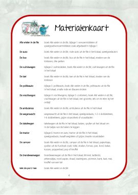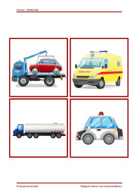 Dit project over vervoermiddelen is geschreven bij het grappige prentenboek ‘Alle wielen in de file’ van Harmen van Straaten. Het bevat reken- en taalactiviteiten, een bewegingsles, een beeldende activiteit, een motorische activiteit en twee spellen. KAMELEON projecten zijn te gebruiken op de peuterspeelzaal, in de eerste kleuterklas, het asielzoekerscentrum, het speciaal (basis)onderwijs of op het kinderdagverblijf.