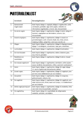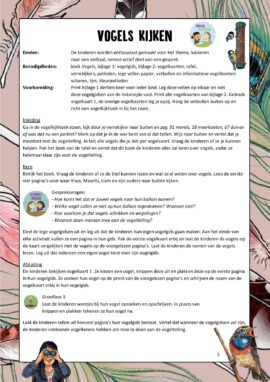 Tip! Richt binnen een vogelkijkhoek in van waaruit de kinderen de vogels buiten kunnen bekijken. Denk hierbij aan verrekijkers, vellen papier, kleurpotloden, boeken over vogels en vogelvoer om de vogels te lokken.
