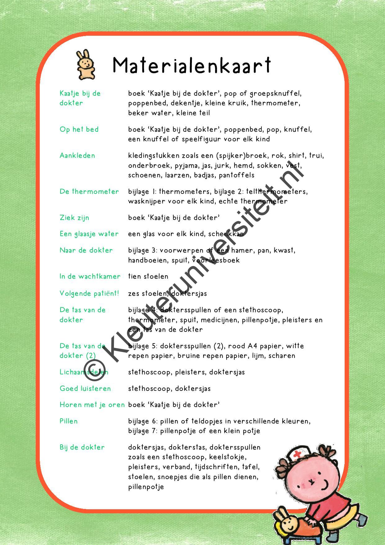 In de startactiviteit maken de kinderen kennis met de zieke Kaatje. Tijdens de activiteiten die hierop volgen, gaan de kinderen met Kaatje naar de dokter. Ze wachten in de wachtkamer, kijken in de dokterstas, worden onderzocht en krijgen tenslotte pillen mee om beter te worden. Het project wordt afgesloten met een bezoek aan de dokter op school. Hij onderzoekt de zieke poppen en knuffels van de kinderen.