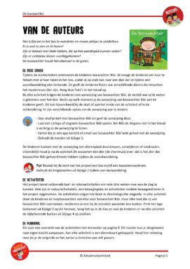 Het project bevat voldoende taal- en rekenactiviteiten om ruim drie weken mee aan de slag te kunnen. Ook zijn er natuuractiviteiten, een bewegingsles en activiteiten rondom bewegend leren in het project opgenomen. De activiteiten volgen het boek in chronologische volgorde. In elke activiteit doen de kinderen als hulpboswachter een klus voor boswachter Bibi. Voor elke taak die zij van boswachter Bibi overnemen, verdienen ze een bij de activiteit passende bos-button. Print het lege buttonvel uit bijlage 3 op A3 formaat, hang het op in de klas en laat de kinderen er na elke activiteit de bijbehorende button uit bijlage 4 op plakken.