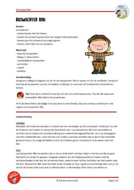 Boswachter Bibi hoort een vreemd geluid in het bos. Ze gaat op zoek naar het dier dat dit geluid maakte. Hierdoor heeft ze geen tijd voor de taken in het bos en roept ze de hulp in van de kinderen. Als hulpboswachters voeren ze de dagelijkse taken van een boswachter uit en volgen daarbij het boek ‘De boswachter‘ van Liesbet Slegers. Ook speuren ze mee in de zoektocht naar het onbekende dier. Dit goed gevulde project bevat materiaal voor 3 weken of meer.